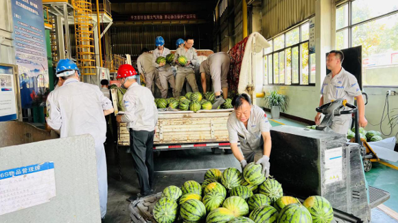 截至6月13日,已为一线职工送矿泉水210余件、西瓜5780斤、老冰棍100件、藿香正气水20件、职工食堂每天为职工免费提供绿豆汤。